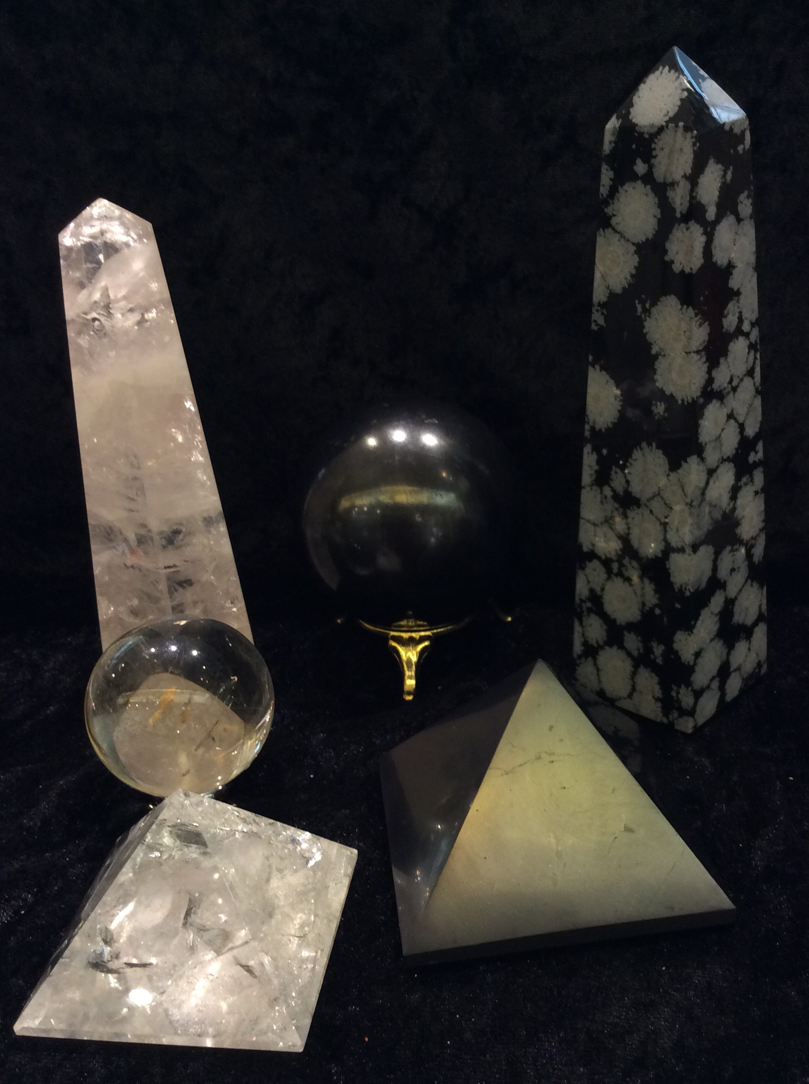 Rosenquarz Obelisk, Shungit Kugel, Schneeflockenobsidian Obelisk, Bergkristall Kugel, Shungit Pyramide, Bergkristall Pyramide