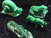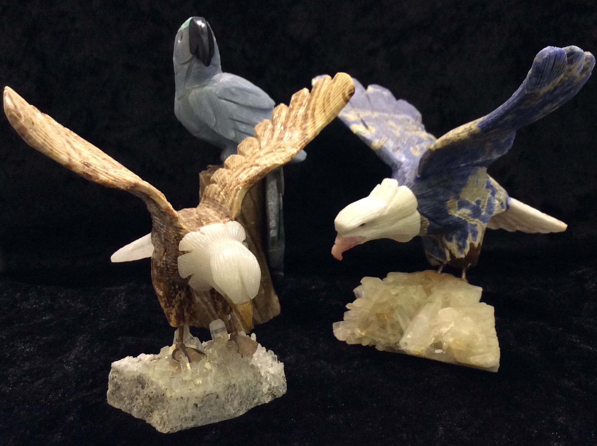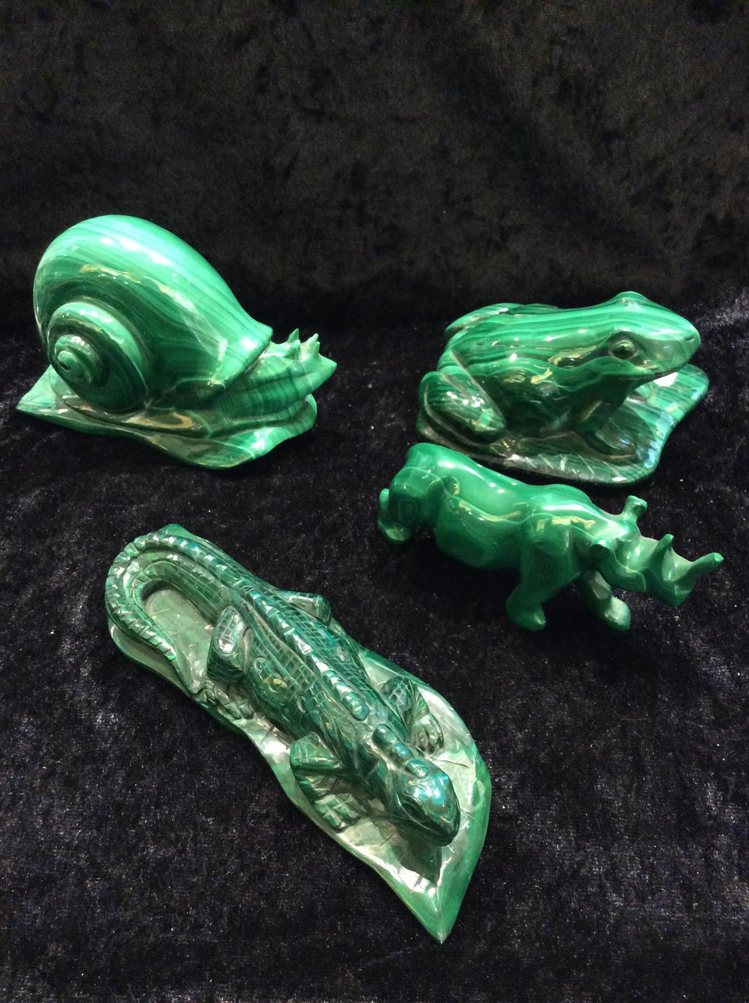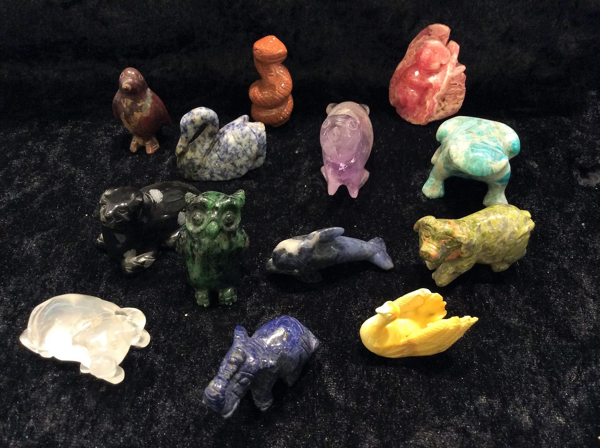 Bild: Regenbogen-Jaspis Pinguin, Sodalith Schwan, Goldfluss Kobra, Amethyst Robbe, Rhodochrosit Koala Bär, Amazonit Frosch, Schneeflockenobsidian Robbe, Zeosit Eule, Sodalith Delfin, Unakit Schwein, Pearlquarz Wasserbüffel, Lapislazuli Elefant, Bernstein Schwan
